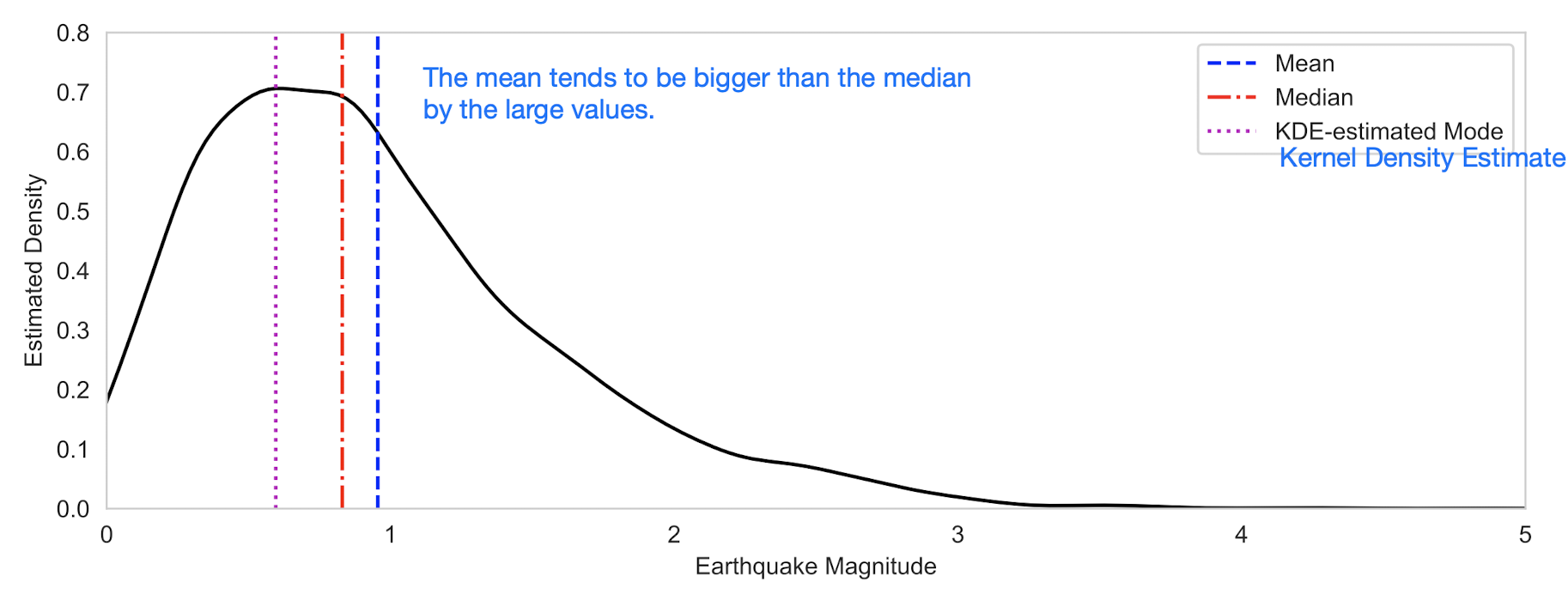 - Mode: More common than those around or local maximum in the density. For discrete data, this can be uniquely determined as the most common value(number of frequency, number of events etc.). For Continuous data, it needs to be estimated(estimating distributions)