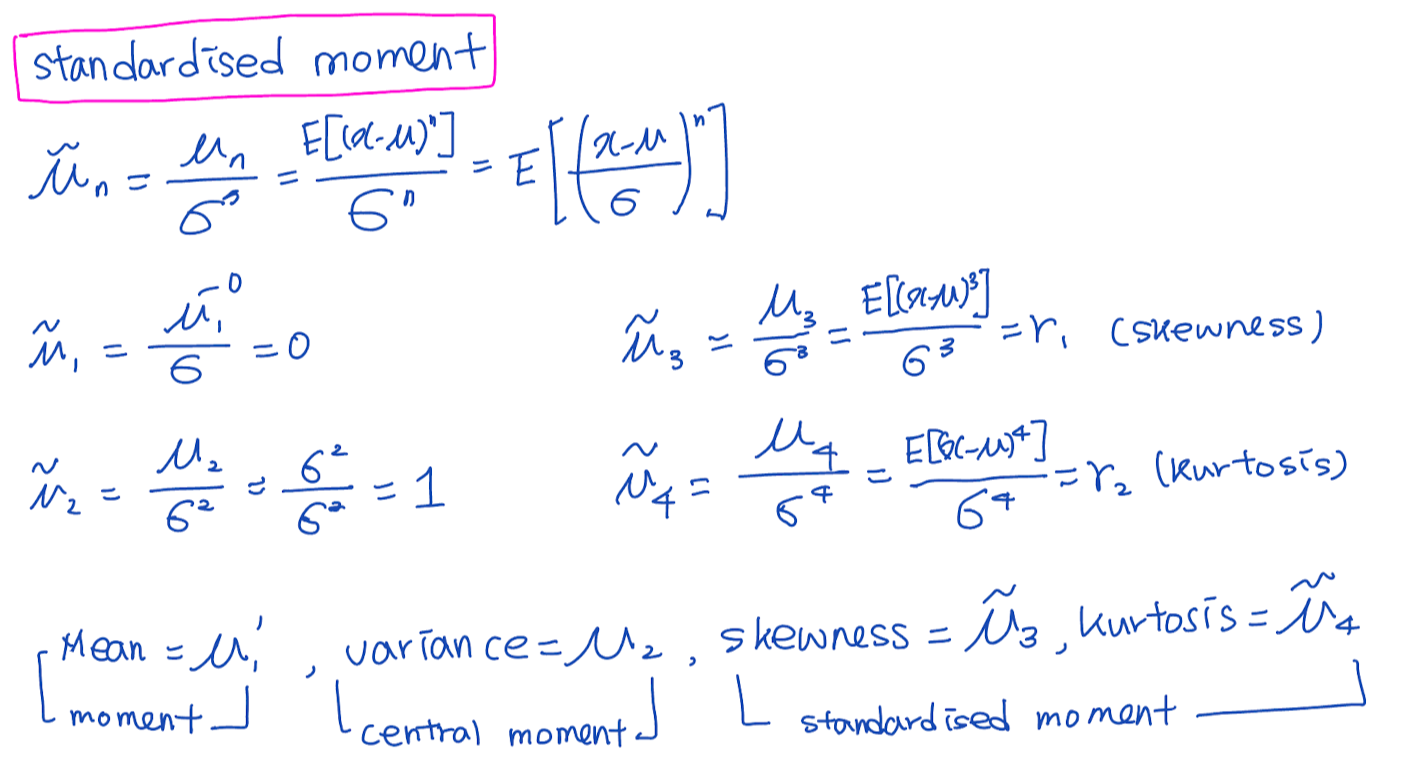 | moment , r=1 | central moment , r=2 | standardised moment, r=3 | standardised moment, r=4 |