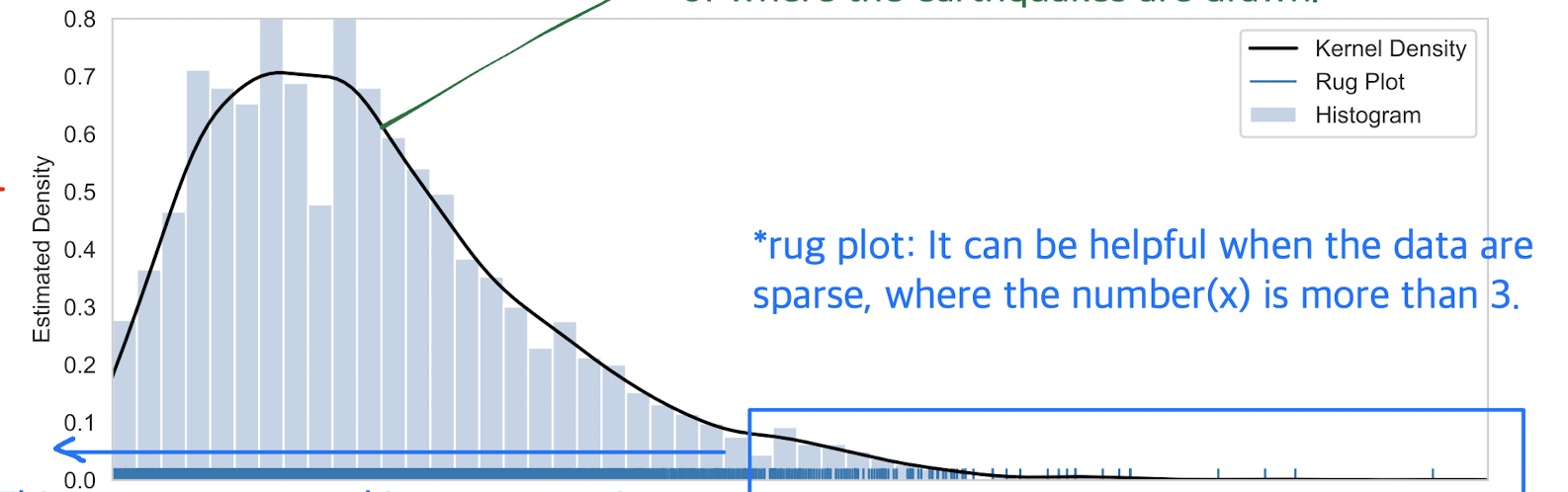 1. Rug plot: tiny vertical tick on the x-axis for each data point(lossless- where the parts are merged into a continuous bar)