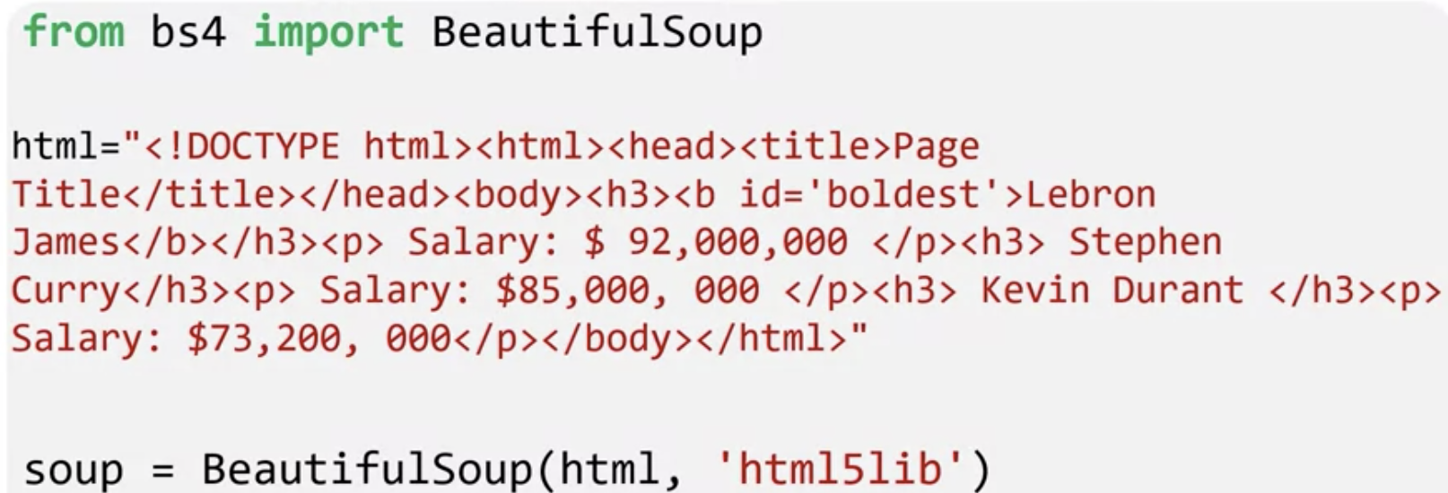 html="<!DOCTYPE html><html><head><title>Page Title</title></head><body><h3><b id='boldest'>Lebron James</b></h3><p> Salary: $ 92,000,000 </p><h3> Stephen Curry</h3><p> Salary: $85,000, 000 </p><h3> Kevin Durant </h3><p> Salary: $73,200, 000</p></body></html>"