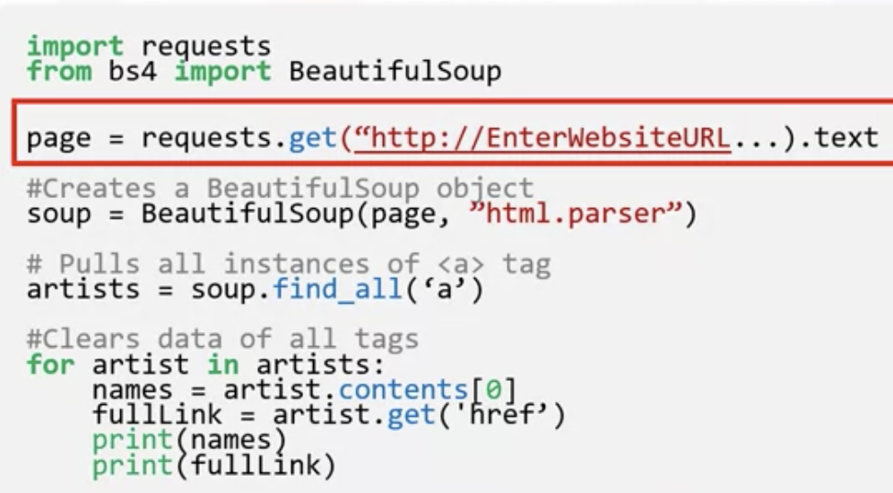 : Store the webpage HTML as a string in the variable HTML. To parse a document, pass it into the BeautifulSoup constructor.