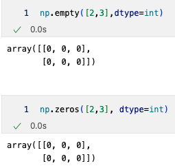 When creating a new array of a given shape and typing in a programming language like Python, the values in the array are usually initialized to some default value. The default value can depend on the data type and language, but in Python, for example, the default value for a new array of integers is 0, and a new array of floats is a small, positive value close to 0.