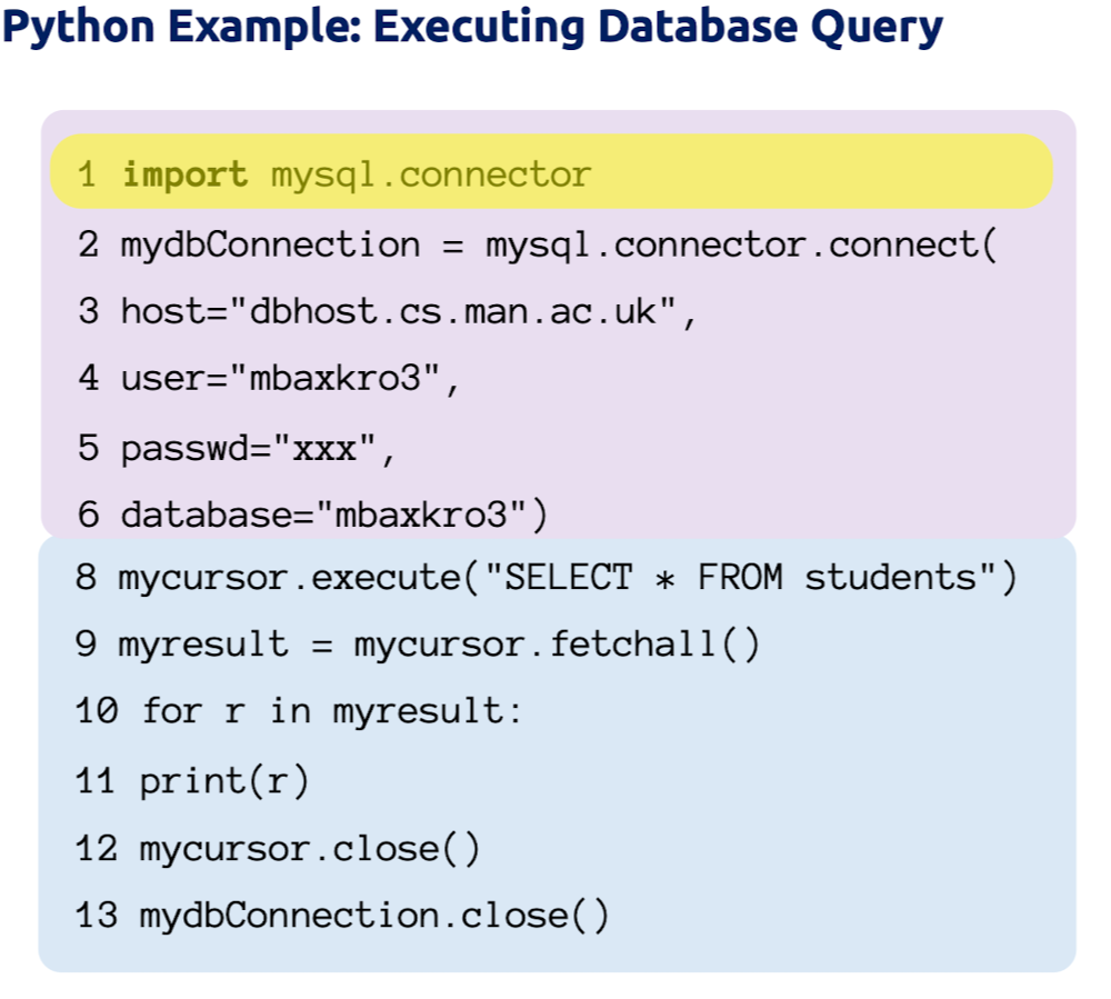 - Using a library of DB functions or classes to connect DB, prepare and execute a query, execute an update, loop over the query result