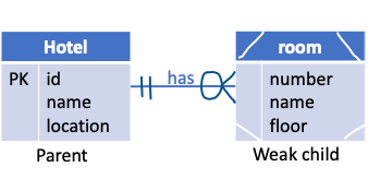 If a certain entity's existence totally depends on another entity, we call it a weak entity. For instance, hotel_Room can not exist if the hotel does not exist; thus, hotel_room is a weak entity. This Weak entity doesn't have PK. Instead, it has a discriminator/partial key. Which can be composited with PK of the parent table, and the composite of PK of the parent table + Discriminator used as a composite key. (Hotel.id + room.number can be used as identifier)