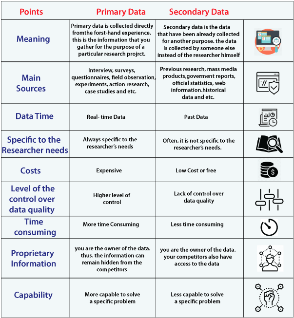 Difference between Primary Data and Secondary Data with list of top differences and real time examples including images, dog, cat, gross, net, java, database, science, general, english etc.